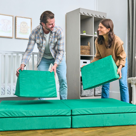 The Play Couch is a four piece set featuring two foldable rectangles and two triangles that transform into forts, slides, tunnels and more.
