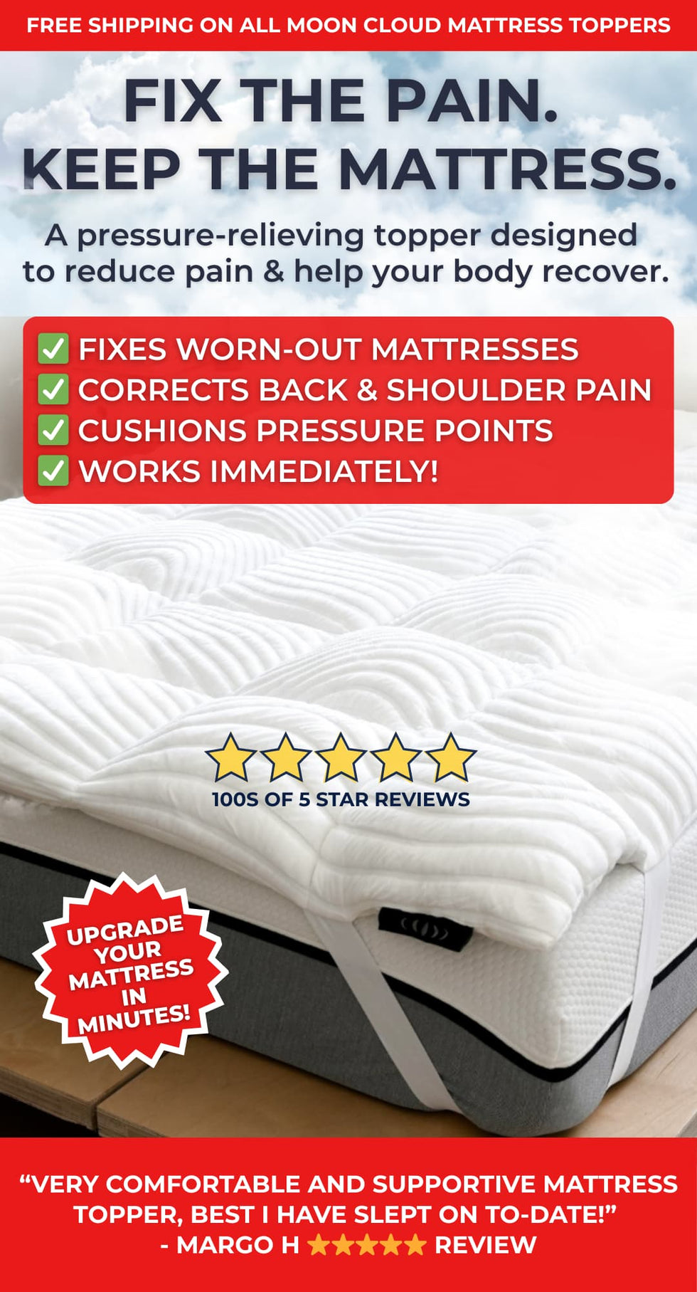 I have recommended the Moon pod cloud mattress topper to at least 5 people now! I am so comfortable and pain free in bed now!