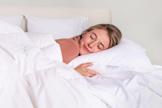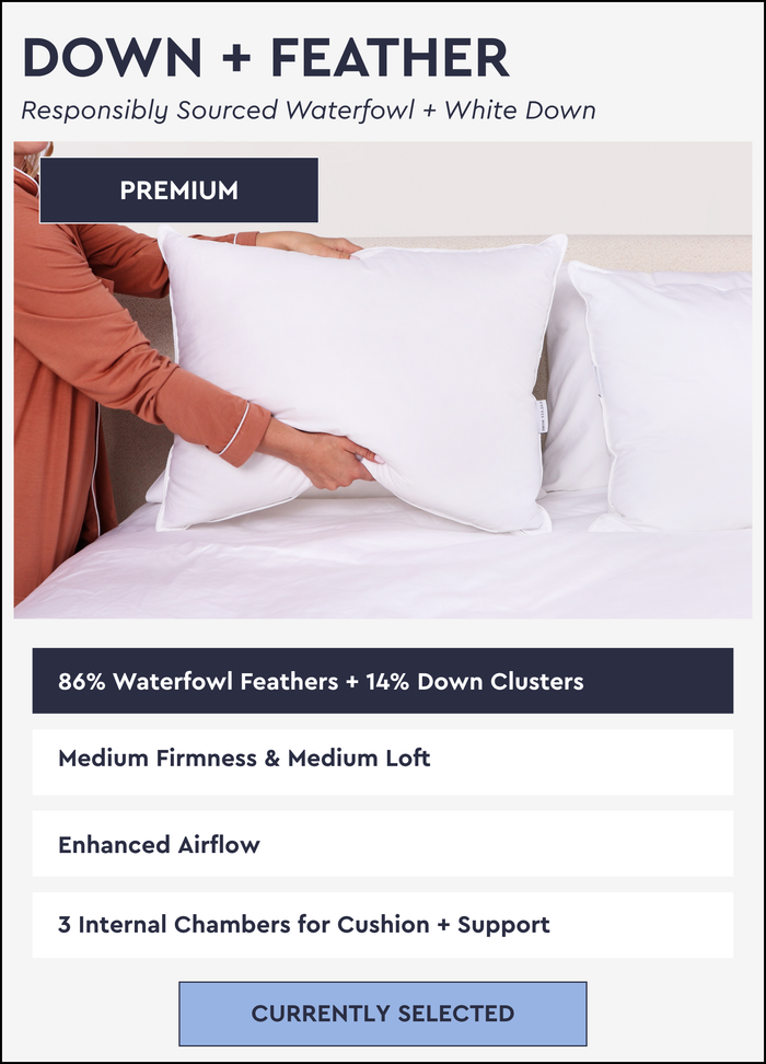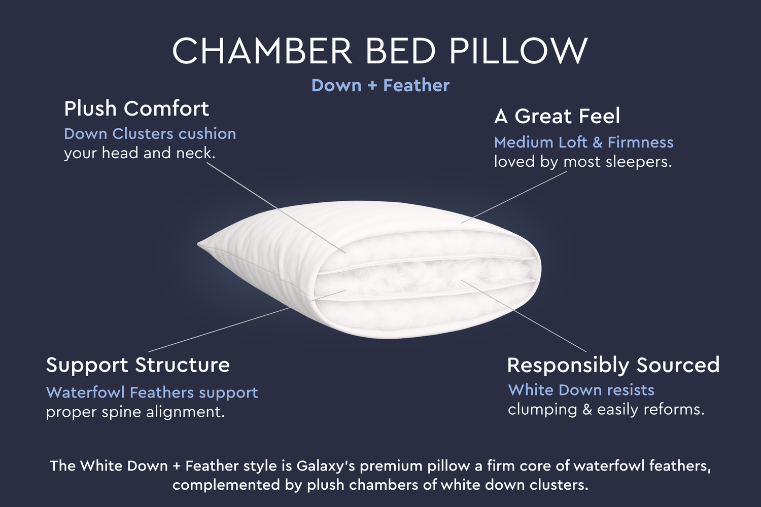 The White Down + Feather style is Galaxy's premium pillow featuring a firm core of waterfowl feathers, complemented by plush chambers of white down clusters.